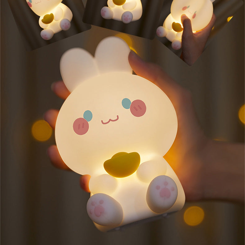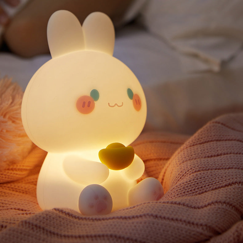 Laat je ruimte stralen met de Bunnygold LED Nachtlamp. Dit schattige konijntje met rosige wangen, blauwe ogen en een gouden staafje in zijn armen brengt een warme en uitnodigende gloed in elke kamer.