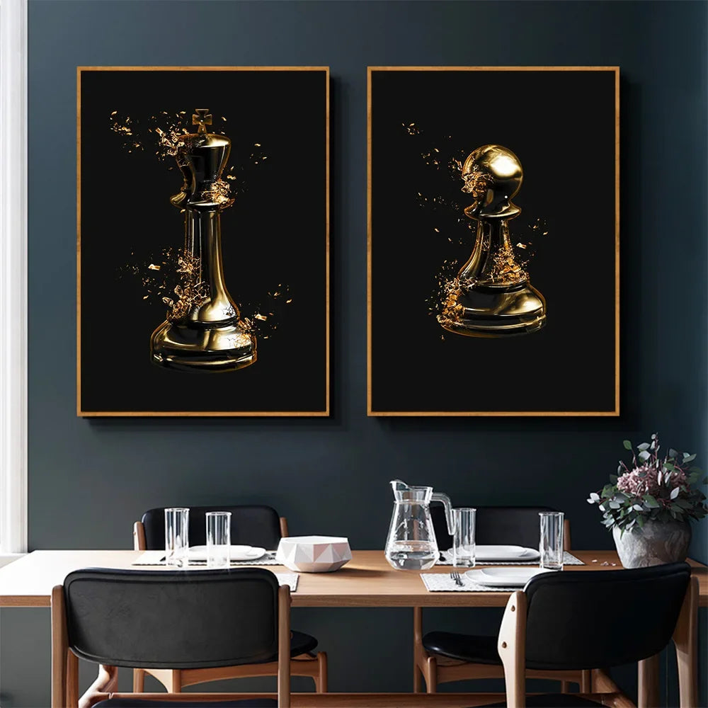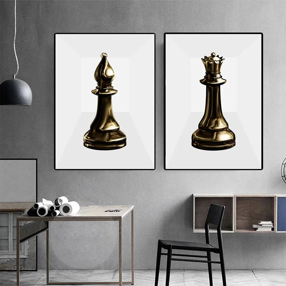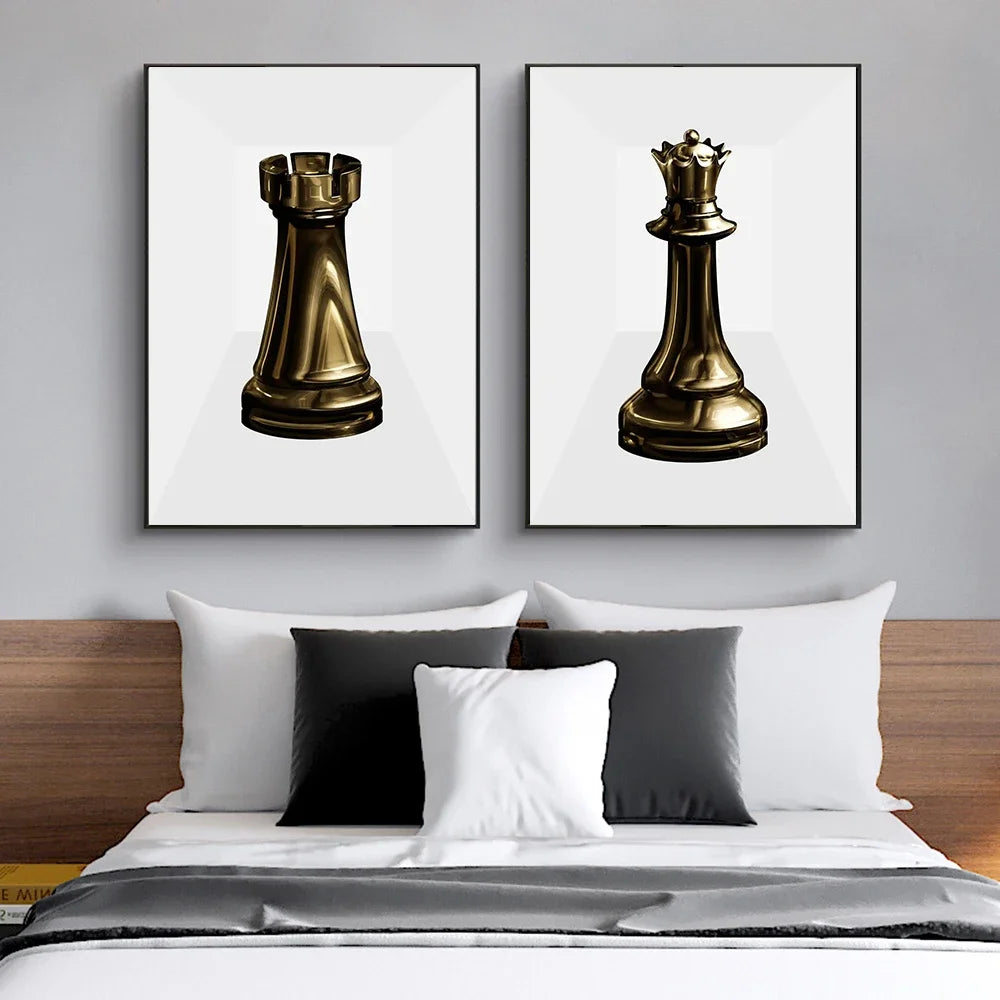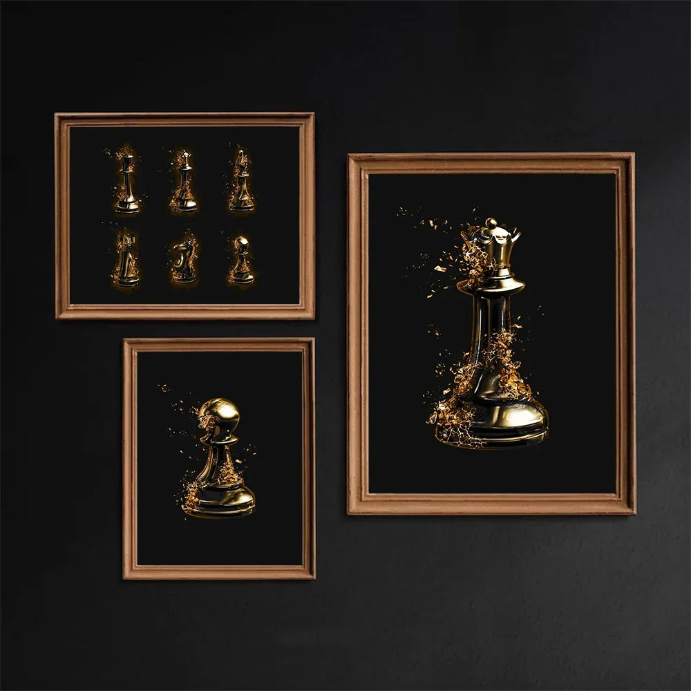 ChessArt - Vintage 3D Gouden Schaakstukken Poster met Elegante Gouden Accenten voor Woonkamer Decoratie