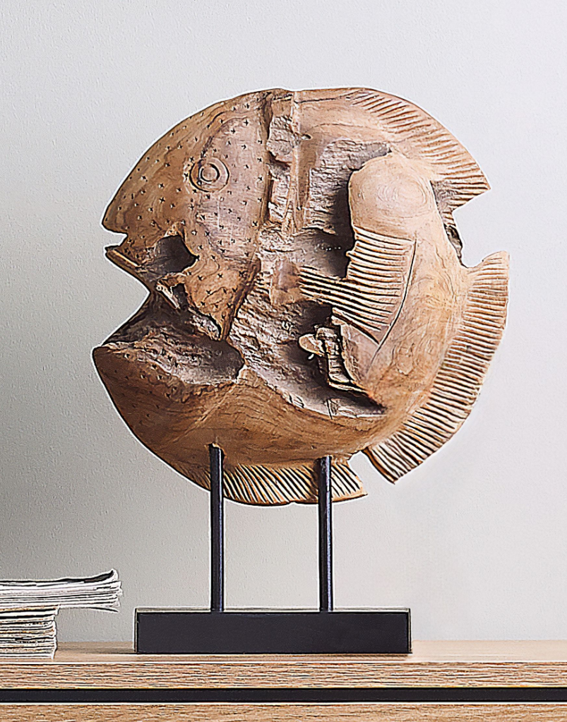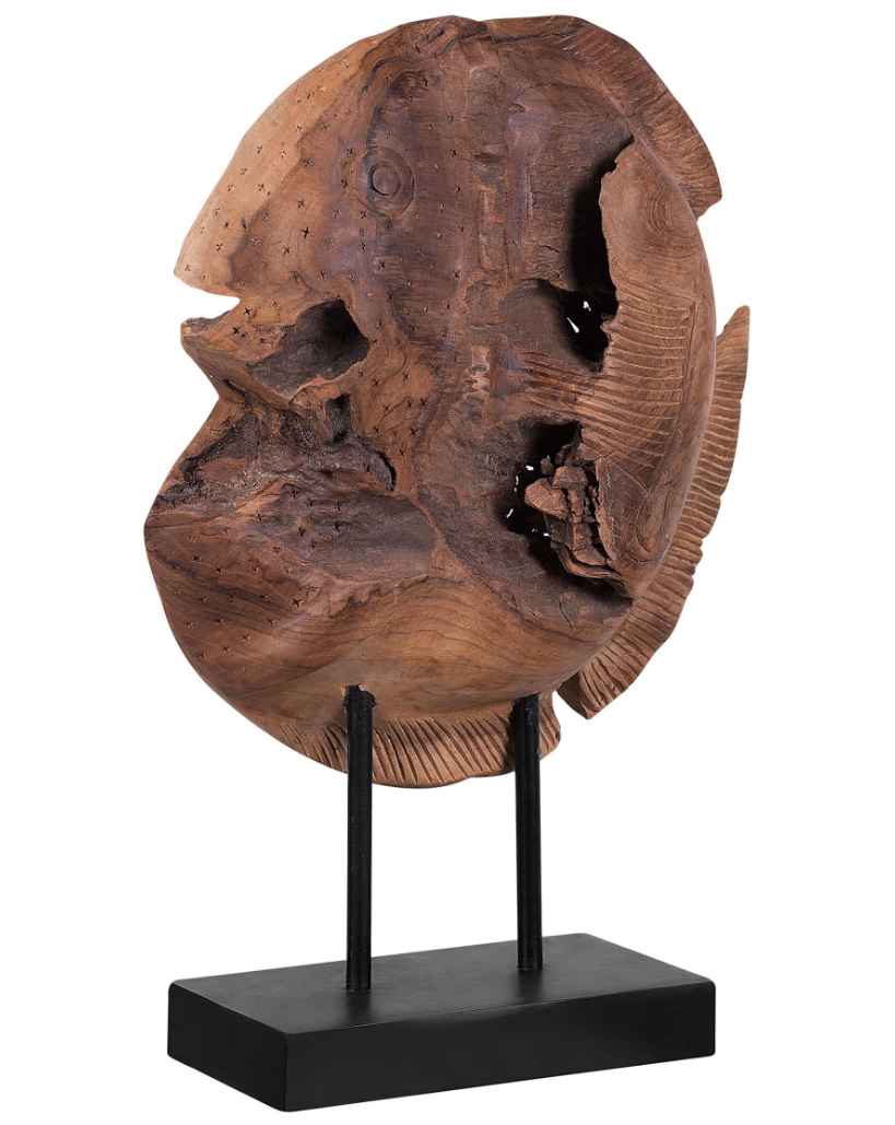 Breng de rustieke charme van de zee in huis met dit handgemaakte teakhouten vissculptuur. Perfect om een vleugje natuur geïnspireerde elegantie toe te voegen aan elke woonkamer, hal of kantoor. Dit unieke stuk valt op door zijn onregelmatige teakhoutstructuur en natuurlijke schoonheid.