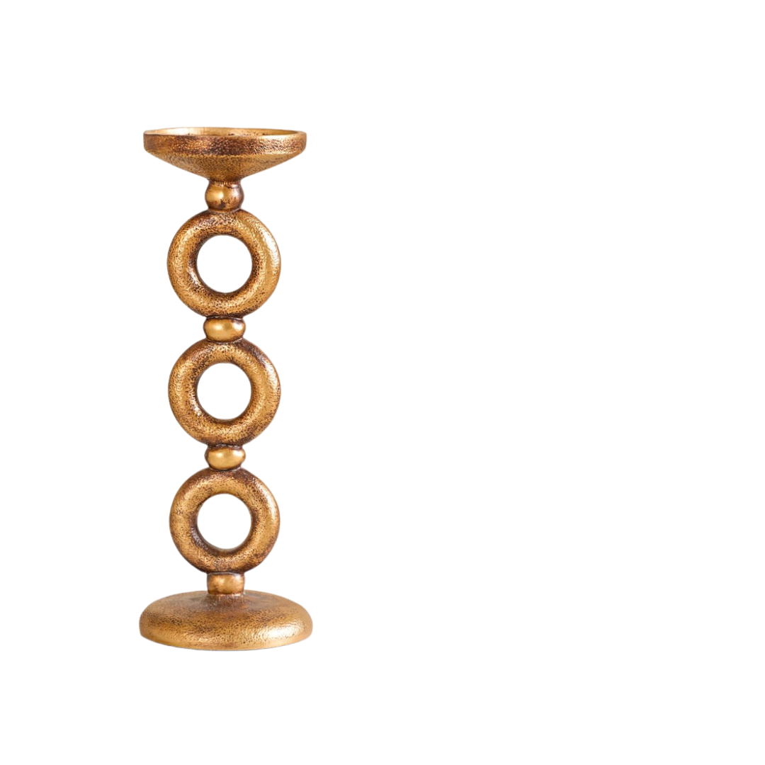 Transformeer uw leefruimte met de betoverende Gouden Gloed Hoge Rustieke Kaarsenstandaard. Het opvallende ontwerp en de warme rustieke gouden afwerking voegen een antieke charme toe, waardoor het een prachtig middelpunt vormt dat de sfeer in elke kamer verbetert.
