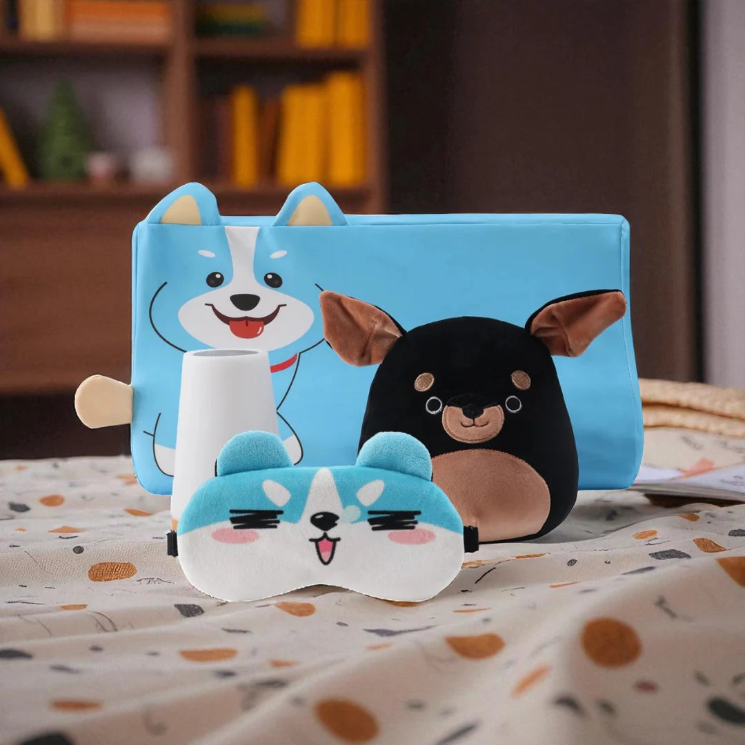 Creëer een compleet avondritueel dat je kindje helpt ontspannen, tot rust te komen en veilig in slaap te vallen. De HappySleep Premium Slaapbundel combineert een zacht kussen, een knuffelvriendje, een schattig slaapmasker én een rustgevend nachtlampje met 7 zachte kleuren – allemaal in een vrolijk hondendesign. Samen zorgen ze voor geborgenheid, herkenning en een ontspannen overgang naar bedtijd.