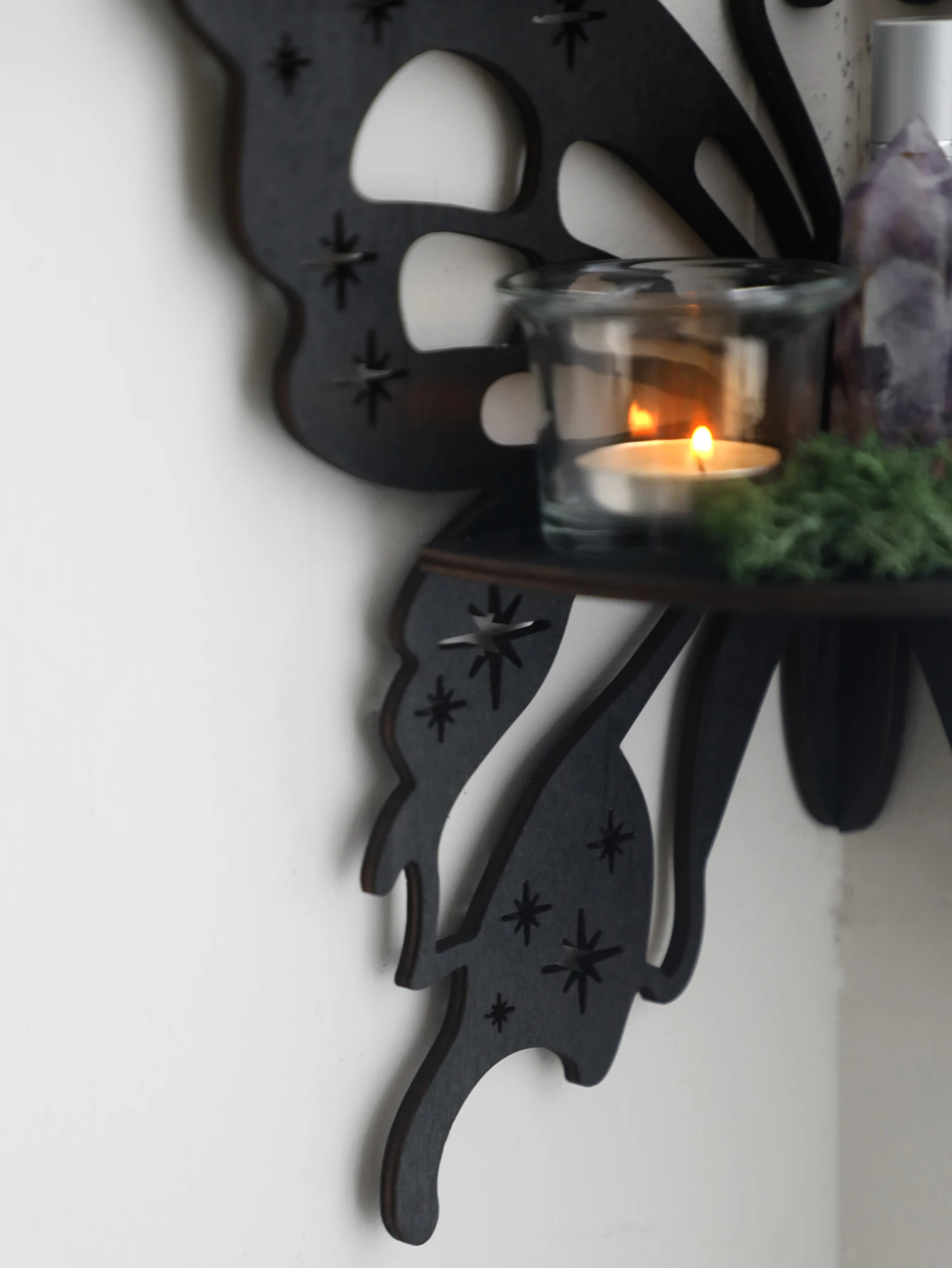 Met het unieke ontwerp van een maan, vlinder en lotus brengt deze prachtige zwevende plank een vleugje natuur en verfijning in elke kamer. Perfect voor het tonen van je favoriete decorstukken zoals kristallen, essentiële oliën, succulenten of kleine planten, deze plank combineert functionaliteit met stijl. Stel je voor dat je je woonkamer binnenkomt, begroet door de zachte lijnen van een prachtig gemaakte wandplank die je meest gekoesterde items bevat. Of je het nu plaatst in je slaapkamer, badkamer of yogaruimte, de LunaFrame plank voegt direct een kalmerende, boho-geïnspireerde sfeer toe die elke ruimte persoonlijker en uitnodigender maakt.