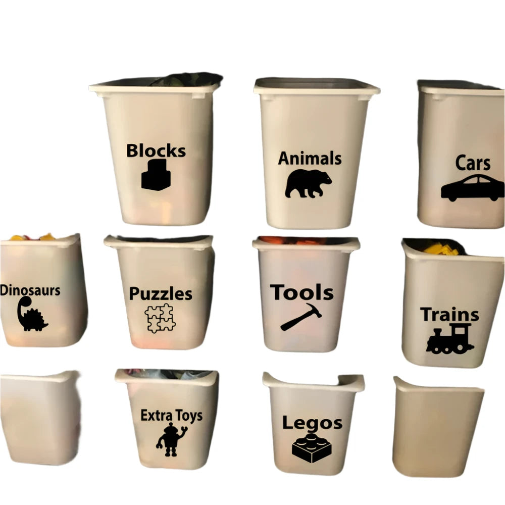 Transformeer de speelkamer, babykamer of slaapkamer van je kind in een visueel aantrekkelijke en georganiseerde omgeving met onze PlayLabel Speelgoedbak Stickers. Deze vinylstickers bieden een eenvoudige manier om speelgoed en items te identificeren met levendige en duidelijke afbeeldingen, waardoor opruimen een eitje wordt