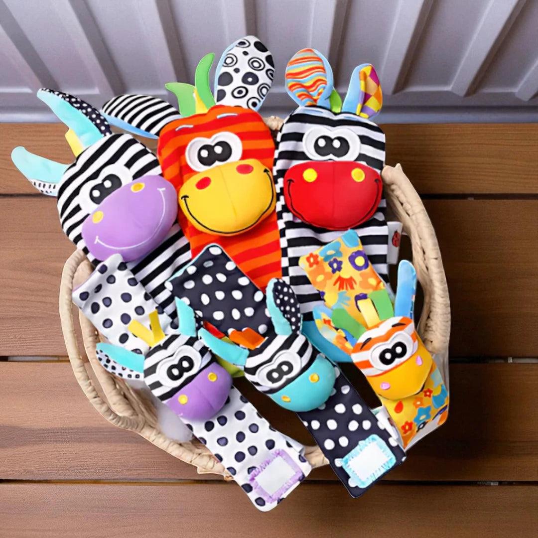 Met RattleJoy wordt elke beweging een klein avontuur. Deze vrolijke sokjes en polsbandjes met zachte rammelaars stimuleren baby’s om te grijpen, trappelen en bewegen, terwijl ze spelenderwijs hun motoriek ontwikkelen.