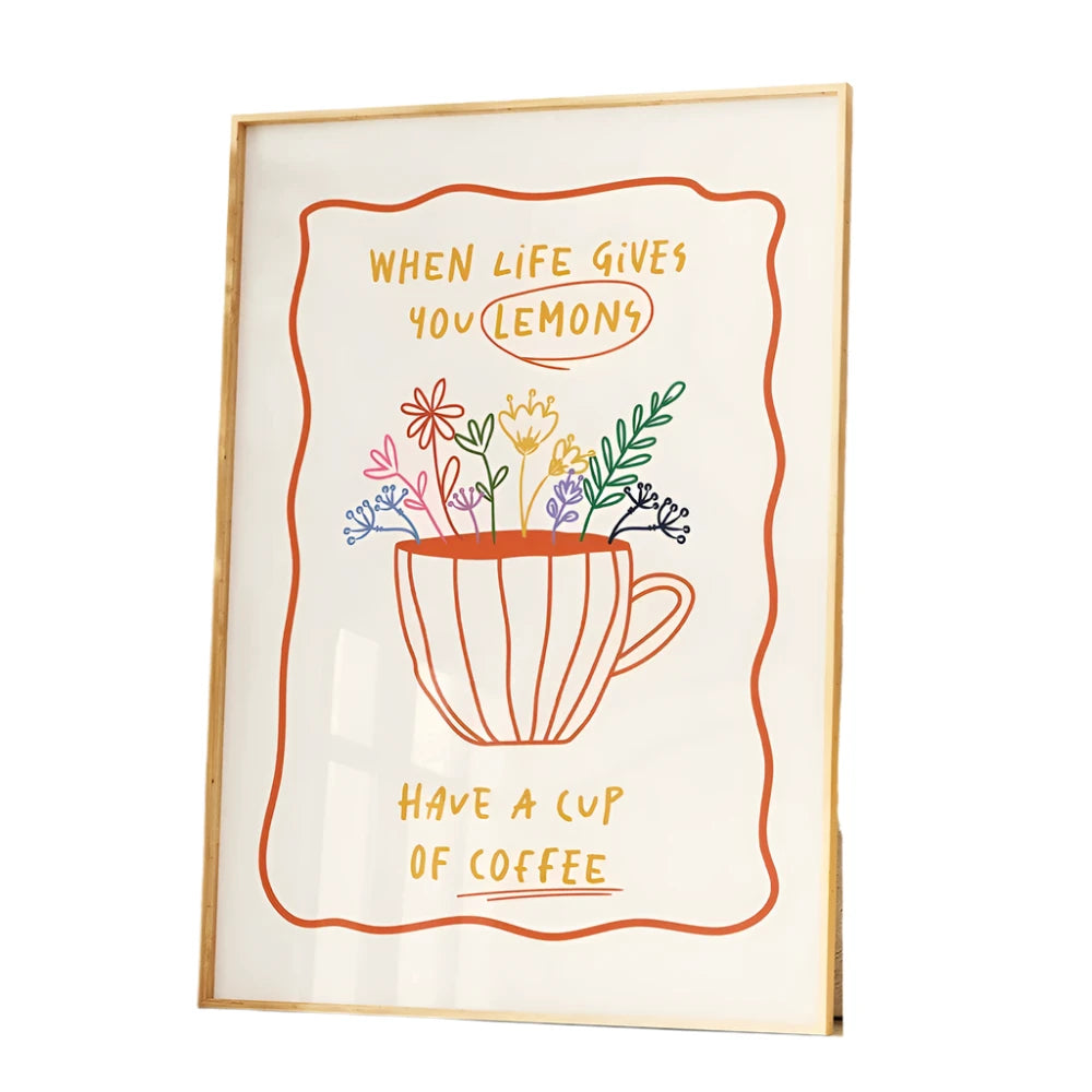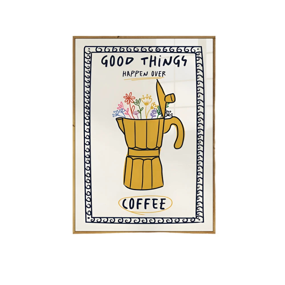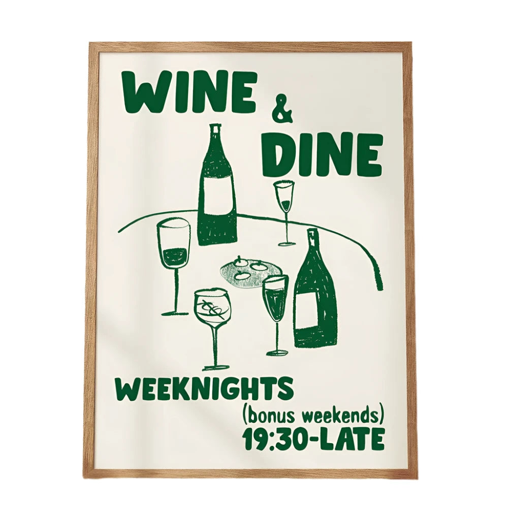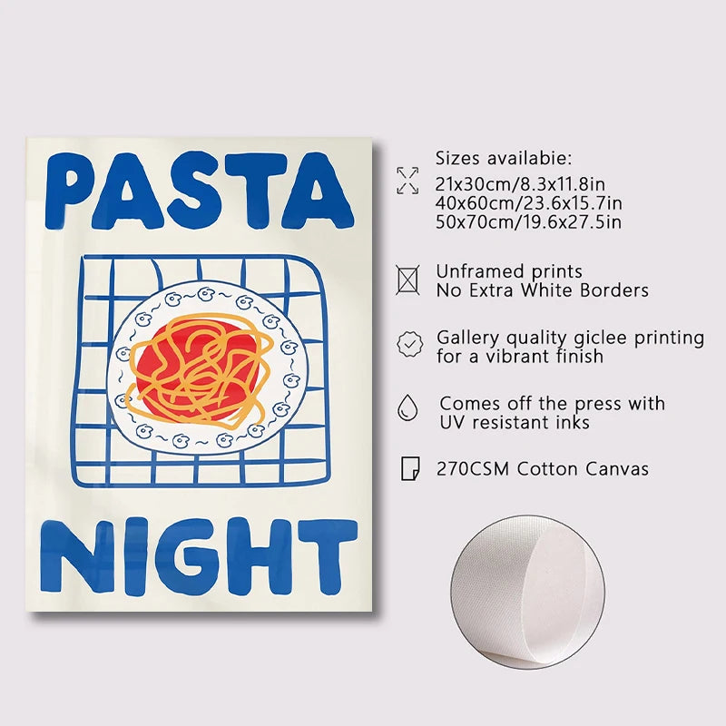 Breng persoonlijkheid en warmte in je huis met de TasteBite Retro Food Print Poster. Met een uitnodigende "Cheers" koffieprint, een levendig wijnmotief en een gezellige pasta-avond, voegt dit kunstwerk een speelse en gedurfde toets toe aan je interieur – perfect voor wie van lekker eten en stijl houdt.